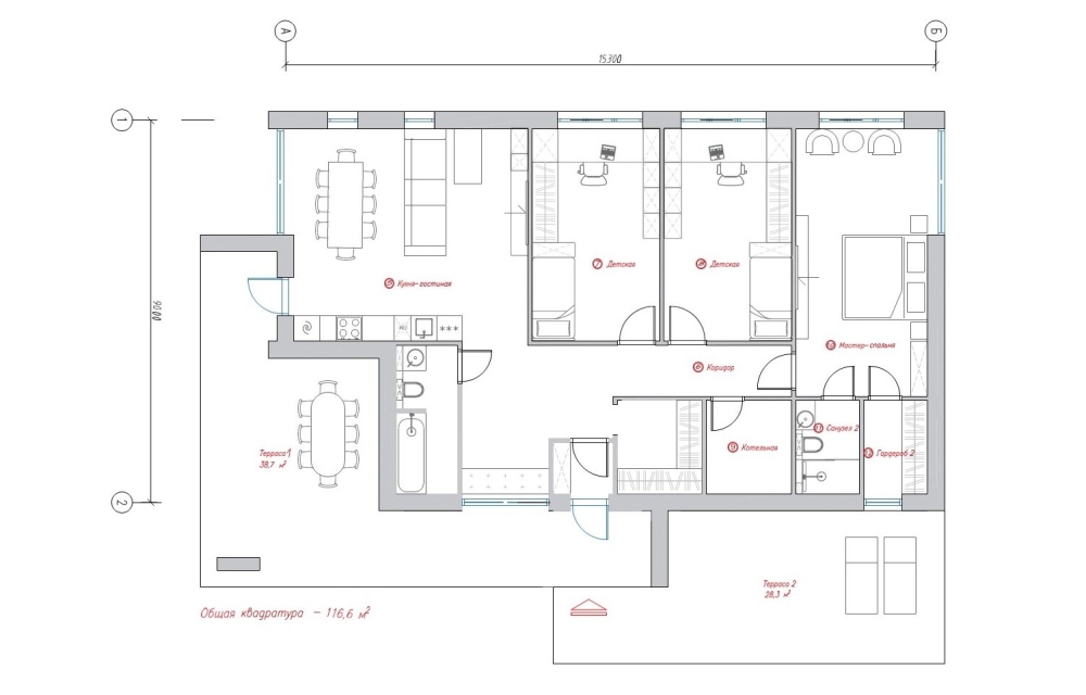 Количество комнат: 3 спальни, 2 санузла, 2 гардеробные, 1 кухня-гостиная.